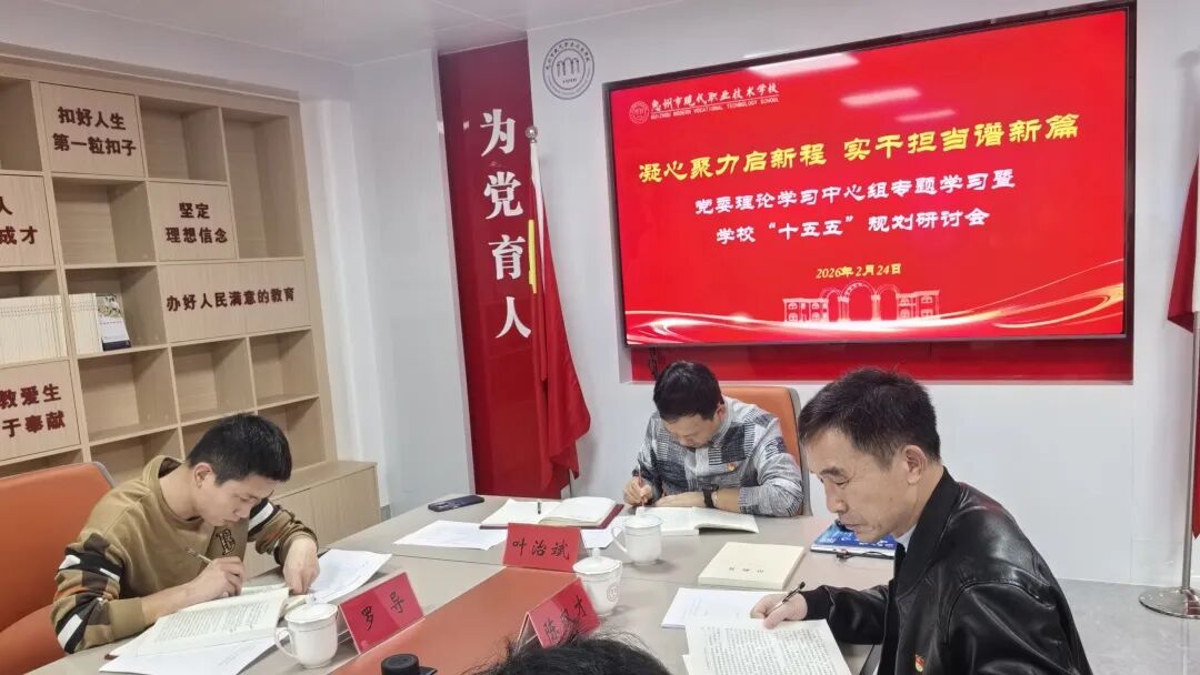 岭南春来早,奋斗正当时。2月24日,惠州市现代职业技术学校在预见党员活动室召开党委理论学习中心组学习暨学校“十五五”规划研讨会。会议由学校党委书记、校长叶治斌主持,全体党政领导班子成员参加。会议深入学习贯彻习近平新时代中国特色社会主义思想,专题研讨学校“十五五”发展规划,为2026年春季学期开局起步凝心聚力。