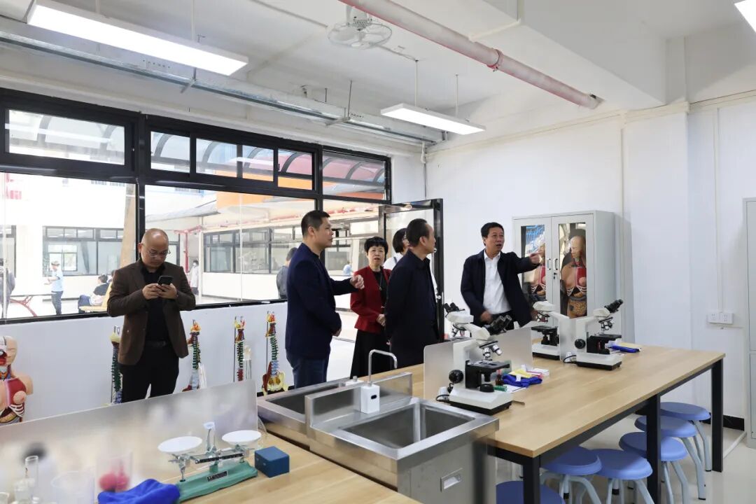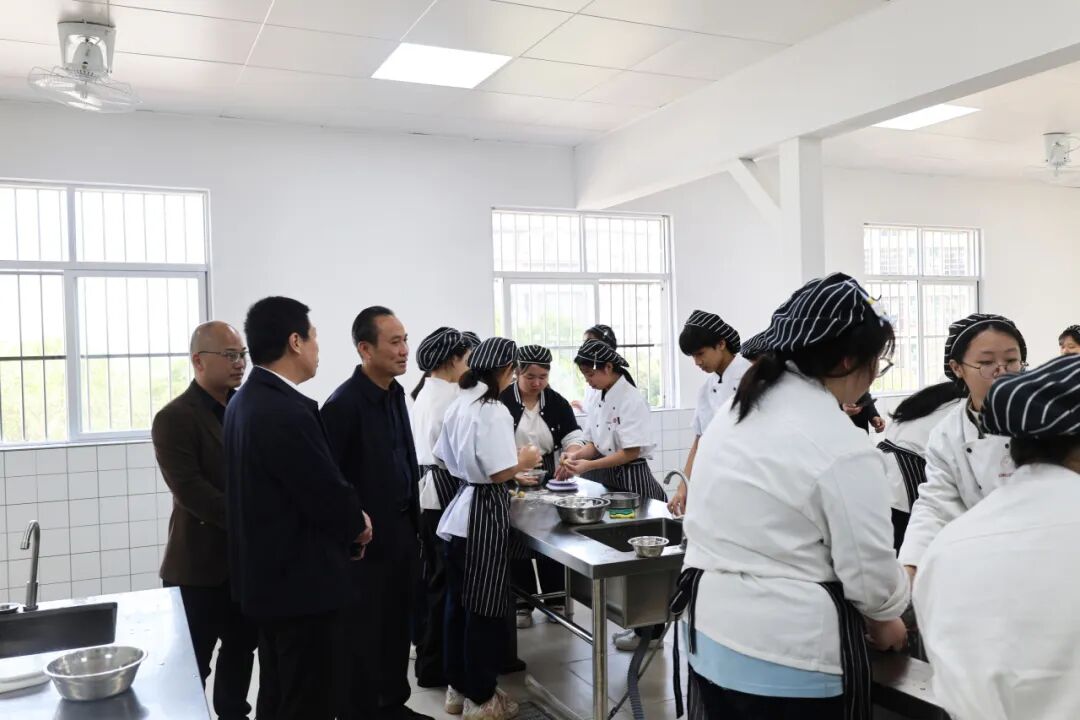 在林学业副校长的陪同下,陆丰职校一行先后参观了烹饪专业实训室、生物技术基础证书实训室、电子商务专业实训室以及美发与形象设计专业实训室。各专业的完善配置和生动的教学实践让参观者频频驻足。林学业副校长结合各专业特点,详细阐述了我校“一业一品”产教融合实践路径。